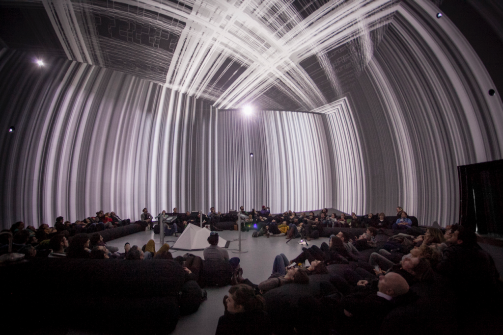 ObE is an interactive audiovisual work designed for immersive environments, developed for the Satosphere at the Society for Arts and Technology. The installation invites the audience to enjoy an evolving sensory experience, whose visual and sound forms transform based on interactions. The work presents itself as a living material with unpredictable behavior, reacting to the audience’s gestures. It combines real-time spatialized sound synthesis and processing, generative 3D visuals, interactive objects in situ, and a dynamic lighting system.